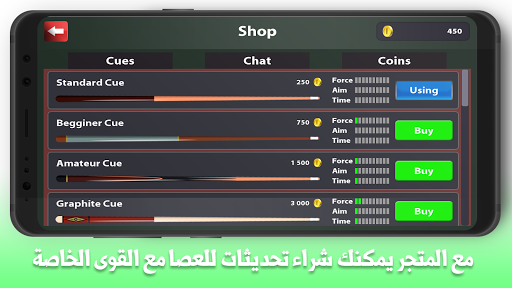 فز بالنقود عند كسبك المبارة واشتري تخديثات لعصا البيلاردو أو حتى العبارات اللي تردي ان تتميز بها في المحادثات مع الخصم..