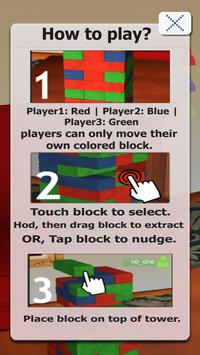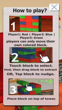 Blocks are divided in three categories of colors: red, blue, and green and each player can only move their colored block. For example player number one can remove Red blocks... the winner is the last person to successfully remove a block.