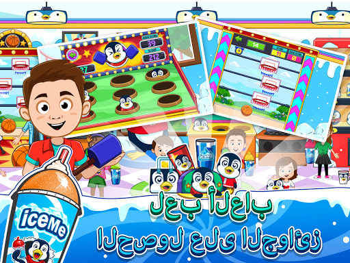 عند رغبتك في أخذ استراحة، يمكنك زيارة متجر ICEME للحصول على حقائب الهدايا وتناول مشروب ICEME لذيذ المذاق في كوب يمكنك أخذه معك إلى المنزل! ثم يمكنك أخذ مشروب ICEME معك إلى إحدى مناطق المطاعم كي تشتري وجبة خفيفة. ولا تنسَ، مدن الملاهي دائمًا ما تكون أكثر مرحًا مع الأصدقاء، ولهذا إذا كانت لديك أكثر من لعبة My Town واحدة، يمكنك إحضار جميع أصدقائك المفضلين في ألعاب My Town إلى المدينة معك!