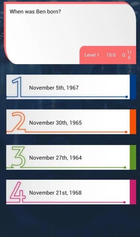 هذه هي لعبة مسابقة ممتعة حيث يمكنك الإجابة على الأسئلة المتعلقة بن ستيلر. هناك مستويات مختلفة في بن ستيلر لعبة مسابقة، يحتوي كل مستوى الكثير من الأسئلة المثيرة للاهتمام حول بن ستيلر تحتاج إلى تحقيق المعايير المطلوبة لفتح المستويات. بن ستيلر التوافه من المثير للاهتمام وسريعة وسهلة الاستخدام.