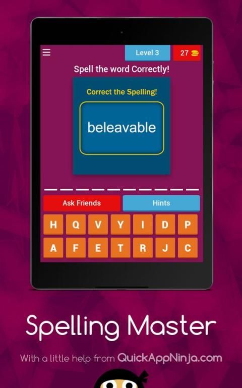 هجاء ماستر - اسمحوا الخاص بك اختبار المعرفة الإملائي في هذه اللعبة من خلال الإجابة على كل مستوى. كل مستوى الشاشة لديه كلمة خطأ إملائي والإجابة عليه بشكل صحيح.