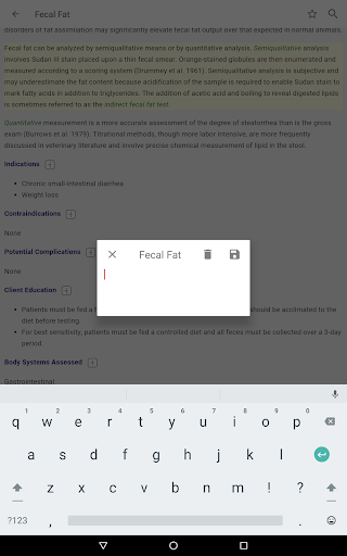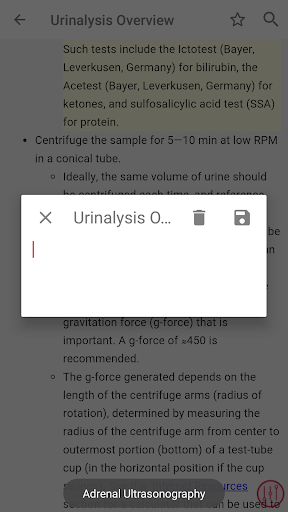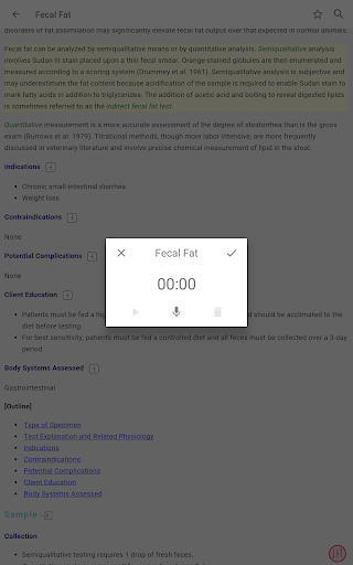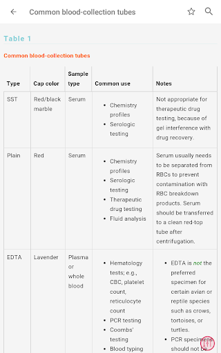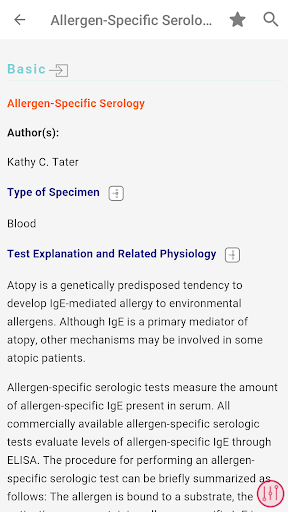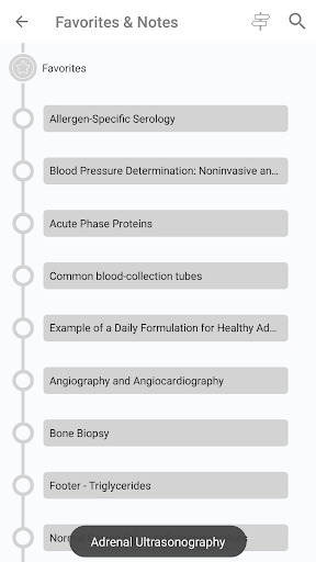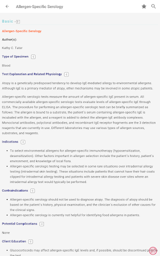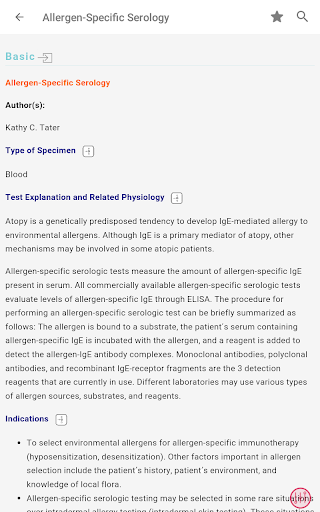 - রক্ত, প্রস্রাব, এবং ফিকাল টেস্ট এবং রেডিওগ্রাফিক, আল্ট্রাসাউন্ড এবং এন্ডোস্কোপিক পদ্ধতি সহ 250 টিরও বেশি পদ্ধতি এবং পরীক্ষা রয়েছে - যথাযথ পরীক্ষা সংগ্রহ এবং নীতিমালা সম্পর্কিত সাধারণ তথ্য রয়েছে অতিস্বনক, রেডিওগ্রাফি, এবং এন্ডোসকপি হিসাবে প্রধান পদ্ধতিতে প্রয়োগ করা হবে, রিসোর্সের সামনে বিভাগে পাওয়া যাবে - রিসোর্সের পরীক্ষাগার পরীক্ষা বিভাগটি ক্লিনিকাল প্রাসঙ্গিক পরীক্ষাগার পরীক্ষায় দ্রুত অ্যাক্সেস সক্ষম করে, পরীক্ষার প্রস্তুতি সম্পর্কিত ব্যাপক তথ্য সহ, কর্মক্ষমতা, প্রতিটি পরীক্ষা প্রভাবিত করে এমন বিষয়গুলি, এবং পরীক্ষা ব্যাখ্যা করার জন্য একটি সংক্ষিপ্ত নির্দেশিকা।