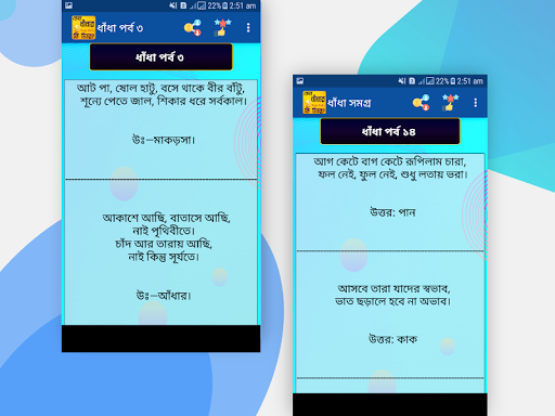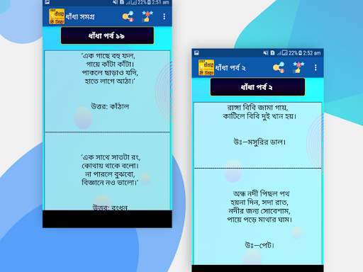 যার ফলে আপনি যেই ধাঁধার উত্তর জানেননা তা এই এপটিতে খুজে পাবেন। আর নতুন নতুন সব ধাঁধা বলে অবাক করে দিতে পারবেন আপনার বন্ধুদের