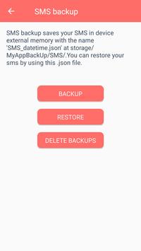SMS Backup save all message in .json file on your device that can be restore later and can be delete backup files using delete backup option.