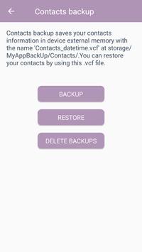 Contact Backup save all contact in .vcf file on your device that can be restore later and can be delete backup files using delete backup option.