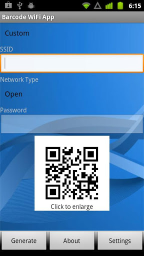 Do you often use wifi to connect internet on your mobile phone? Do you want to get a barcode of your wifi? Barcode WiFi App can generate a barcode of your wifi just by one touch.Do you want to know more about this app?Barcode WiFi App is a free barcode app which is used on mobile phone.1. When you open this app, you will find that there is a page which needs you to input some information You need choose the wifi and input the SSID, type and the password.2. After you have finished your setting, you just touch the GENERATE button, a barcode of your wifi will be produced. You can touch it to see the big image.3. Touching the SETTING button in the bottom right side, you can do some settings on your mobile phone to manage your wifi.4. If you would like to support this app, please give it five stars and share it with your friends and family. If you find any problem of this app, please let me know.Barcode WiFi App is a simple and easy wifi barcode app. It not only can produce barcode but also can let you do some settings of your wifi.Barcode WiFi App is a free wifi barcode app so that you need not to pay for it. I have used this app for a long time and I feel that it is a real good app, so I recommend it to you.I hope that Barcode Wifi App will help you in your daily life.WiFi also lets communications directly from one computer to another without an access point intermediary. This is named ad hoc WiFi transmission. This wireless ad hoc network mode has been popular with multiplayer handheld game consoles, such as the Nintendo DS, Playstation Portable, digital cameras and other consumer electronics devices. A lot of devices can share their Internet connection using adhoc, becoming hotspots or quot;virtual routersquot;.Similarly, the WiFi Alliance promotes a specification which is called WiFi Direct for file transfers and media sharing through a new discovery and securitymethodology.Many traditional college campuses in the United States offer at least partial wireless WiFi Internet coverage. Carnegie Mellon University built the first campuswide wireless Internet network, which is called Wireless Andrew at its Pittsburgh campus in 1993 before WiFi branding originated.In the year of 2000, Drexel University in Philadelphia became the United States39;s first major university to provide completely wireless Internet access across its entire campus