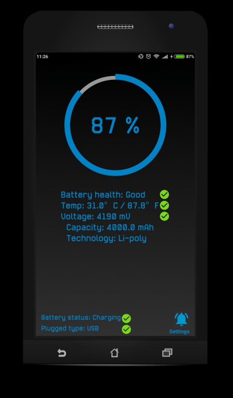 Using this app you can get information about your battery properties and state. Also it will help you not to forget when it's time for charging and will inform you when your charging is already complete