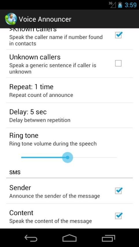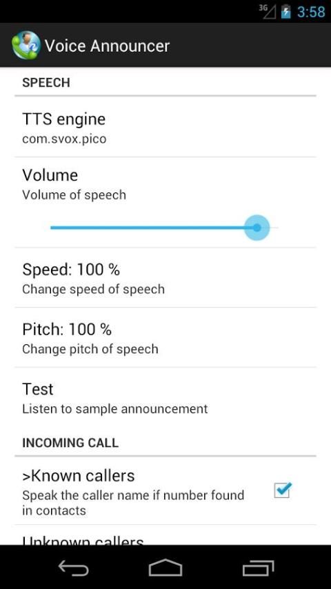 Voice announcer which uses speech synthesis engine to pronounce the name of the caller and read the SMS.