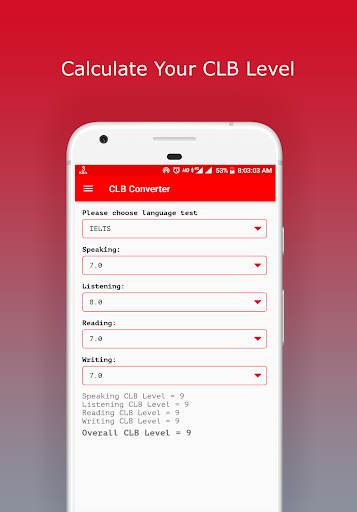 This app also provides converter from your IELTS, CELPIP, TEF Canada and TCF Canada score to CLB level.