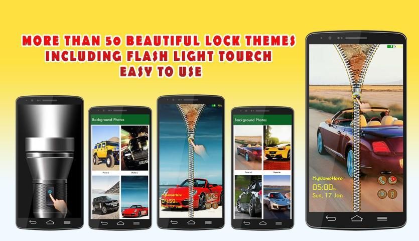 You can customize your mobile screen lock with your selected background, some other useful feature is added you can also choose your own photo as zipper for this you will need to select photo from your camera or gallery and then set as zipper. and another is smart flash light app or emergency light app is also embedded.