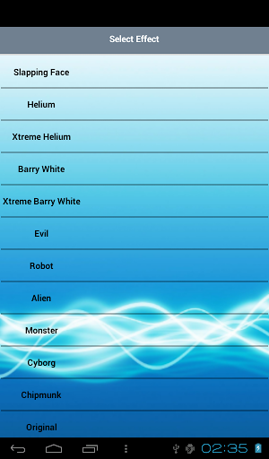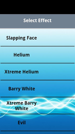 >> বর্তমান ভয়েস প্রভাবগুলি হল: "স্লিপিং ফেস", "হিলিয়াম", "এক্সট্রিম হিলিয়াম", "ব্যারি হোয়াইট", "এক্সট্রিম ব্যারি হোয়াইট", "মন্দ", "রোবট", "এলিয়েন", "দৈত্য", "সাইবার্গ", "চিপমুক", "মূল"।
