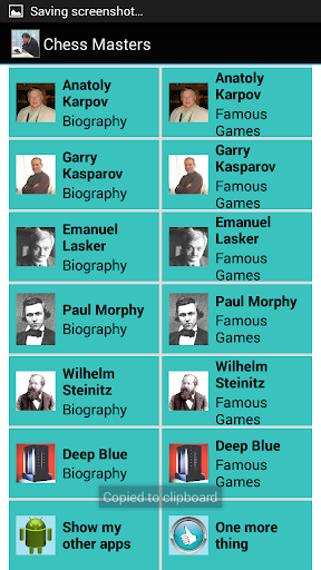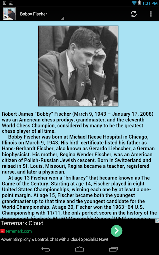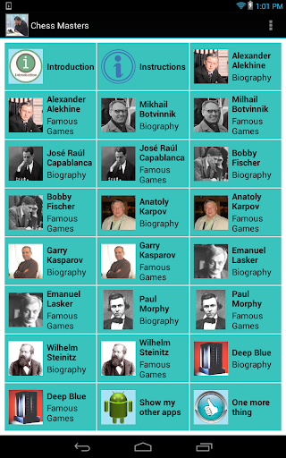 The purpose of this application is to acquaint the viewer with the lives of the ten most famous chess Grand Masters. A portrait of each accompanied with a brief biography is available as well as a link to an incredible web site (Chessgames.com) that permits the user to step through any one of hundreds of games played by them over the years.