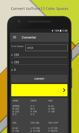 Color Space Converter can convert from one color space to another. Color spaces available to convert: CIE-L*ab, CIE-L*CH°, CIE-L*uv, CMYK, HSL, HSV, Hunter-Lab, RYB, sRGB, XYZ, Yxy.