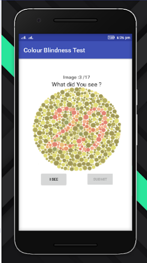 The Ishihara test is a color perception test for red-green color deficiencies. The test consists of a number of colored plates, called Ishihara plates, each of which contains a circle of dots appearing randomized in color and size.Within the pattern are dots which form a number or shape clearly visible to those with normal color vision, and invisible, or difficult to see, to those with a red-green color vision defect, or the other way around. The full test consists of 38 plates, but the existence of a deficiency is usually clear after a few plates. But this test consisting only 17 plates.