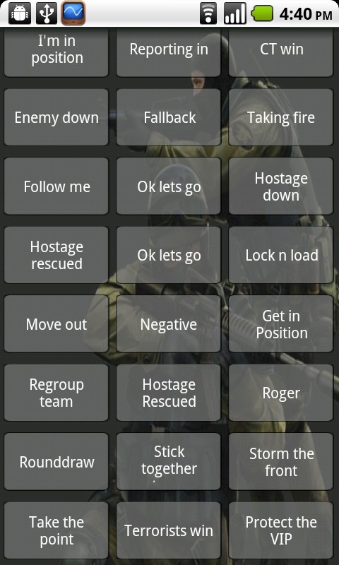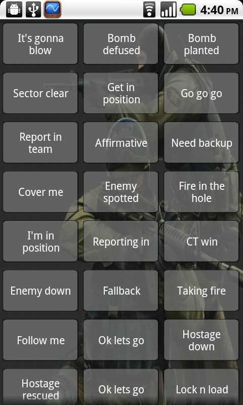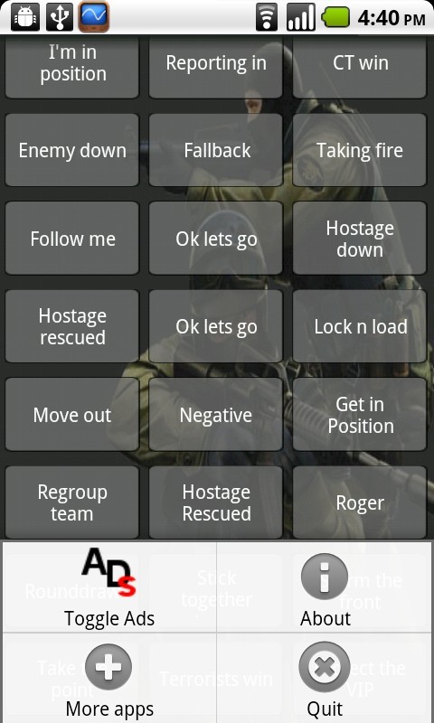 All the radio sounds from Counter-strike 1.6 Long press an item will bring up context menu to save sound file to SD card and set as ringtone or notification. Ratings and feedback appreciated, email me for feature requests. -Optional adverts, to remove press menu and select toggle Ads.