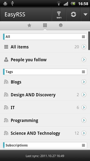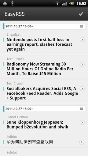 EasyRSS is an unofficial Google reader app for Android. It aims at providing the best user experience for users to read and manage Google Reader items.Features: Sync with Google Reader Image downloading for offline reading Simple swipe between starredallunread items Manage starred items View items by tag or subscription State saving amp; syncing Slide up amp; down to move between items Font size adjustmentNote: Google Reader account requiredEmail: easyrssofficial@gmail.comwebsite http:easyrss.pursuer.meFAQWhy permissions android.permission.GETACCOUNTS and android.permission.MANAGEACCOUNTS are needed?EasyRSS need to acquire the Google accounts on your phone, to make it easier for users to log in.Acknowledgement: Special thanks to @teki207 and @soyofuki for Spanish and Japanese translation.What39;s new?0.5.14 Fix restart of the app when orientation changes.0.5.13 Fix bug in syncing unable to sync sometimes. GPU acceleration support.0.5.12 Spanish support. Be able to save image to SD Card. Faster scrolling in viewing items. Fix bug in syncing when sync failed.0.5.11 Be able to change syncing interval. Fix several bugs in syncing.0.5.10 Faster quot;mark all as readquot;. Be able to copy item to clipboard. Syncing plan optimization. Autohide item menu.0.5.9 Be able to choose between builtin and external browsers UI speed up.0.5.8 Builtin browser. UI speed up.0.5.7 Scrolling improvements. Reducing view switching waiting time.0.5.6 Setting to turn off mark all as read confirmation. UI updates.0.5.5 Inapp image viewing. UI performance improvements. Fix a bug that may cause crash when syncing.0.5.4 Fix crash bug on some Android devises.0.5.3 UI improvements, more fluent scrolling and improved menu bar in item reading interface. Faster quot;Mark all as readquot;. Showing quot;1000quot; instead of quot;1000quot; when there39;re more than 1000 items. Fix a UI issue on ICS machines.0.5.2 Dark theme support. More sharing options support sending item content to Google, etc. Larger font support.0.5.1 Turn back to home screen after quot;mark all as readquot;. Fix a bug in quot;mark previous as readquot;.0.5.0 IMPORTANT UI update. Fix a bug that may cause crash in syncing.0.4.3 Fix a bug in syncing. Fix a bug that may cause crash in some cases.0.4.2 Notification. UI improvements greatly optimized when swiping back.0.4.1 Item ordering ascending or descending ordering of publishing time. Several bugfixes.0.4.0 IMPORTANT EasyRSS Mobilizer. Fix a bug in background syncing.0.3.3 UI improvements faster speed. Support for smaller font size. Fix a bug in syncing item state. Fix a bug in fetching article link. Fix a bug in showing the author of the article.0.3.2 IMPORTANT UI improvements less memory amp; faster speed. Fix a bug in syncing unread items in subscriptions. Sharing improvements.0.3.1 Mark as unread feature. Fix a bug that may cause large memory consumption. Optimize scrolling when viewing items. Syncing optimization.0.3.0 IMPORTANT Swipe to turn back to the last screen. Sharing improvements. Syncing optimization.0.2.8 Fix encoding bugs on Meizu phones.Be sure that this bugfix will be valid only for the newerloaded items Larger font support. Volume key navigation between items. Item syncing optimization.0.2.7 Item auto loading when reading. Fixed a bug in sharing items. Fixed a bug in syncing.0.2.5 Support sharing with subjects.0.2.4 Optimization in syncing. Support for Amazon app store.0.2.3: More choices in image syncing.0.2.2: Add Japanese support. Fixed a bug in syncing.0.2.1: Better quot;send item content toquot; feature.0.2.0: Adapt to new Google Reader. Add quot;send item content toquot; feature.Keywords: RSS, Google Reader, NewsRob, gReader
