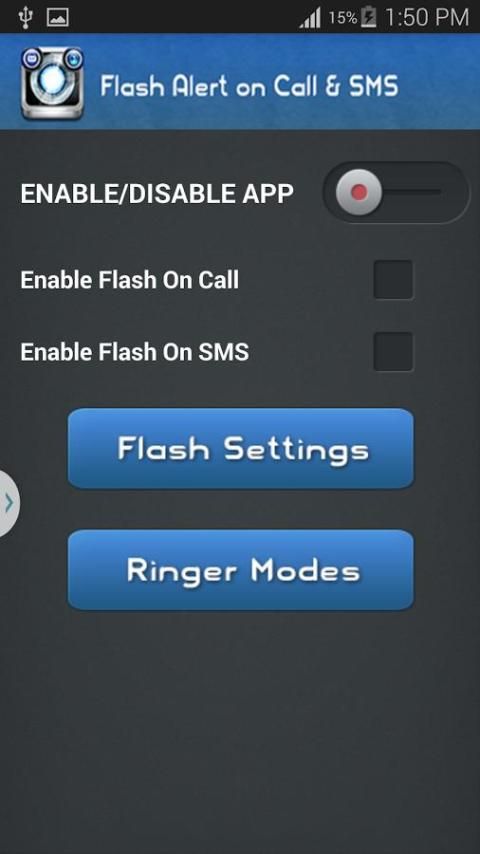 ♦ Flash On Call application is very flexible in a way that you can enable / disable it completely for both call and SMS, or you can just select to use the flash functionality for either call or SMS.