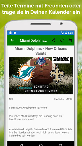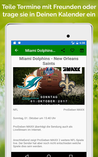 - Kemasukan kalendar. Dengan satu klik, anda boleh membuat catatan kalendar dalam kalendar peribadi anda supaya anda tidak terlepas permainan anda. Dengan penggera tepat pada waktunya sebelum permainan dimulakan, tentu saja.