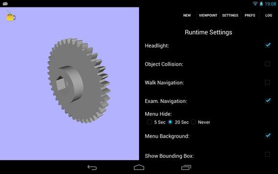 Rotate or zoom STL files; X3D files you can examine, and walk around your 3D Scene. Use one finger to rotate or walk, two to either zoom or move up and down, depending on the Nav setting.