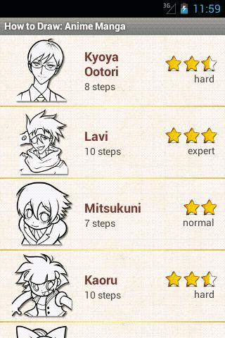 Fun and easy way to learn how to draw Anime Manga Characters! Try yourself or teach your kid.Each drawing divided in 8 to 15 steps, and its easy to follow.Have fun with this lessons at home, in school, on paper chalk on asphalt - do it everywhere!In our application you will find lessons that will teach you how to draw:- Kyoya Ootori, Ouran High School Host Club- Lavi From D Gray Man- Mitsukuni Haninozuka, Ouran High School Host Club- Kaoru Matsubara, Powerpuff Girls Z- Momoko Akatsutsumi, Powerpuff Girls Z- Tomoki Sakurai, Sora no Otoshimono- Sunako Kirishiki, Sunako Kirishiki From Shiki- Toshio Ozaki, Toshio Ozaki From Shiki- Yuuki Natsuno, Yuuki Natsuno From Shiki- Neuro Nougami From Majin Tantei Nougami- Kurisu Makise, Kurisu Makise From Steins Gate- Rintarou, Rintarou Okabe From Steins Gate- Chocolat, Chocolat from Sugar Sugar Rune- Asuna From NegimaLearn how to draw and improve your skill in no time with the help of our simple android application. Whether you're an art teacher, art student, or just a hobbyist artist you will find the step by step education that will give you the ability to bring those images in your mind into paper reality.Being a kid or a novice artist can sometimes get discouraging because of the lack of skills one has when they are in this artistic stage. Learning how to draw in a very simple manner is the best way to advance your skills to becoming a better artist. It doesn't matter if you are thirteen, or thirty, there is a lot of concepts you can tackle as you browse our program There is one thing that is certain, you will definitely become a better artist just by tackling the lessons you find here. So go ahead and try and draw, because no matter what you choose to do, you are guaranteed to achieve your artistic goals. Have fun everyone!Short review of charcters you will draw in our application:- Kyoya Otori is an attractive, calculating second-year student at Ouran Academy and vice-president of the Host Club. He was born on November 22 and is 17 years old at the beginning of the series.- Lavi is a cheerful 18-year-old red-haired Exorcist of mixed race. He aims to become a Bookman, a person who records the hidden history of the world, and has been trained from a young age to achieve that goal.- Honey is depicted as a childish and cake-loving boy who is much older than what his elementary school appearance would indicate. He is also a strong fighter who can send people flying with one kick. When Haruhi is warned about his legendary fighting skills, the point is illustrated in the anime by a mushroom cloud erupting where a city had once stood. - Kaoru Matsubara or Powered Buttercup is one of the three main characters in PowerPuff Girls Z. Like her American counterpart Kaoru is the tomboy of the team and hates anything girly (especially skirts). Her main weapon is a hammer. Her signature color is green. - Momoko Akatsutsumi is the self-proclaimed leader and first member of the Powerpuff Girls Z. A thirteen year Added by Chrismh old Otaku in seventh Grade with a major sweet tooth who is admittingly not the best at school. Momoko lives with her parents Hachizou and Kakiko, and her more serious little sister Kuriko Akatsutsumi. Momoko is represented by the colors Pink and Red. Her symbol is a Heart.