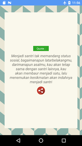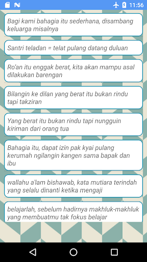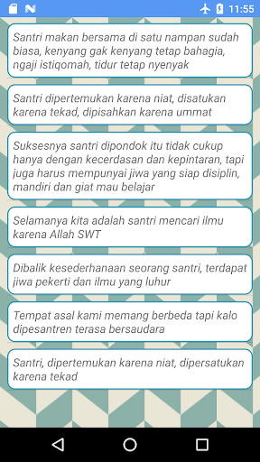 Santri Aphorisms একটি অ্যাপ্লিকেশন যা Santri এর জীবনে aphorisms একটি সংগ্রহ রয়েছে।এই হৃদয়কে অর্থপূর্ণ এবং স্পর্শ করা যে এই হৃদয়টি স্পর্শ করে আপনি ইন্দোনেশিয়ান সান্ত্রী হিসাবে আবারও আরো অনুপ্রাণিত করেছেন যিনি এখনও ইসলামী বোর্ডিং স্কুলে পড়াশোনা করছেন।