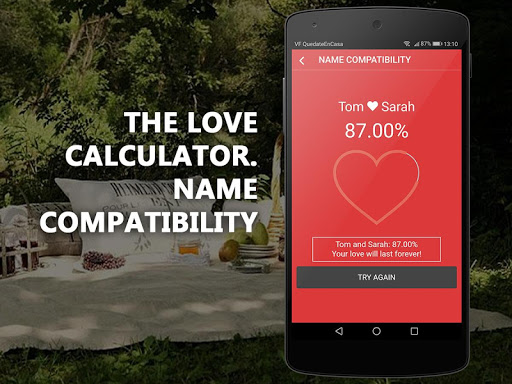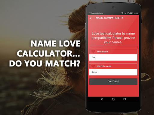 প্রেম পরীক্ষা একটি বিনামূল্যে অ্যাপ্লিকেশন যা আপনি দুই মানুষের মধ্যে প্রেম শতাংশ গণনা করতে ব্যবহার করতে পারেন। প্রেম ক্যালকুলেটর আপনার ডেটা এবং কৈশিক থেকে কাজ করে এবং একটি প্রেম পরীক্ষক হিসাবে সঠিক সামঞ্জস্য খুঁজে বের করার জন্য যত্ন নেয়।