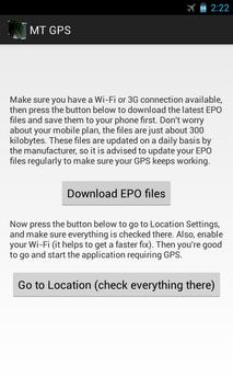 If you have a mobile device with a MT6577/MT6589(T)/MT6592 chipset, you probably noticed the GPS functionality is pretty bad. Most notably, it can be quite difficult to get a 'fix'. This can be resolved by saving recent EPO files, which are used for Assisted GPS. These EPO files can be downloaded manually (which takes some time), or you could just use MT GPS!