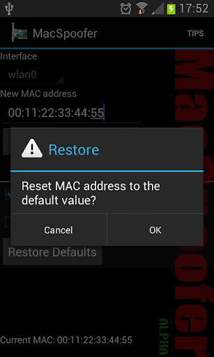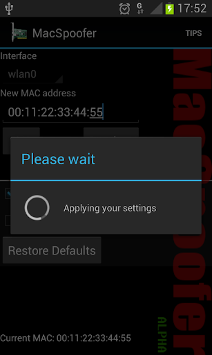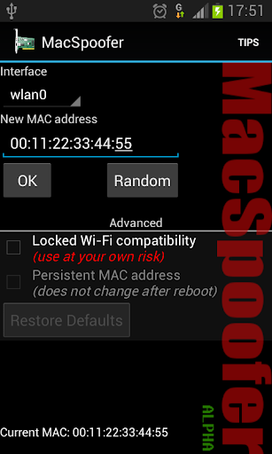 A simple app to help you spoof your device's MAC address. It has only been tested on Samsung Galaxy S3 mini, stock ROM, thus I cannot guarantee that it will be functional on any other devices, please report. In some occasions address spoofing will fail, please try a different MAC address.
