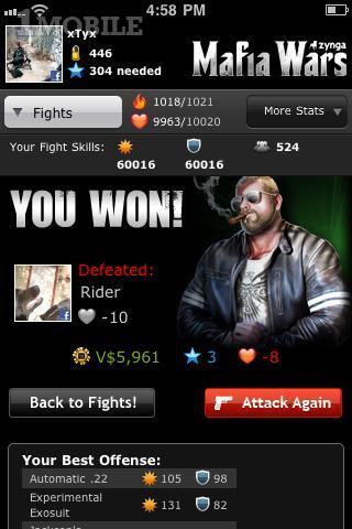 Take your criminal empire on the move with Mafia Wars by Zynga. Take your criminal empire on the move with Mafia Wars by Zynga! Featuring AN all new location with unique jobs, exclusive rewards and daily bonuses. With all your same stats and items from Zynga’s Mafia Wars on Facebook, you can now fight your friends, make bank deposits and collect your properties from anywhere! Zynga Inc. is the world’s largest social game developer with more than 295 million monthly active users playing their games. Zynga’s games include FarmVille, FrontierVille, Mafia Wars, Zynga Poker, Café World, Words With Friends and CityVille. Use of this application is governed by the Zynga Terms of Service. http://www.zynga.com/about/terms-of-service.php Collection and use of personal data are subject to Zynga's Privacy Policy. Both policies are available in the Application License Agreement below as well as at www.zynga.com. Social Networking Service terms may also apply.