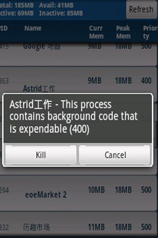 memory MangerWhen you begin to use this software,it will search your phone and make a list of running applications in your phone.After the list come out ,you will know the current memory usage,peak memory usage, priority, and Process ID PID.You can kill the running applications youwant.