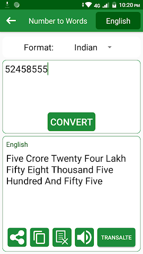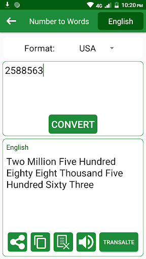 এটিতে মূলত দুটি প্রধান সংখ্যাসূচক ফর্ম্যাট রয়েছে শব্দ রূপান্তরকারী অ্যাপ্লিকেশন সংখ্যা। এক মার্কিন যুক্তরাষ্ট্রের বিন্যাস এবং অন্যটি ভারতীয় দশমিক বিন্যাস।