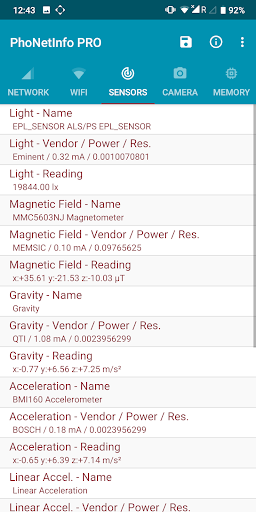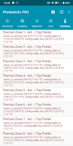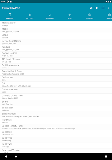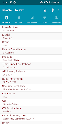 ফরমওয়্যার, উত্পাদন তারিখ, ব্যাটারি তাপমাত্রা, সেন্সর, নেটওয়ার্ক অপারেটর, সিগন্যাল শক্তি, সেল আইডি, নেটওয়ার্ক অপারেটর, ক্যামেরা বিবরণ, মেমরি বিশদ, সিপিইউ বিশদ, ইত্যাদি হিসাবে বিস্তারিত ফোন তথ্য এবং নেটওয়ার্ক তথ্য পুনরুদ্ধার করে।