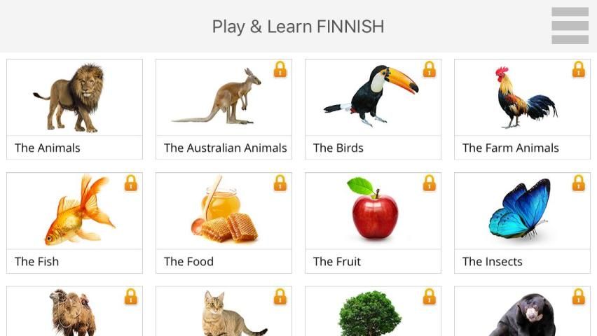 There are four completely free, fun and colourful packs with Play and Learn FINNISH. Each pack has 15-30 beautiful images in it. Additional packs include animals, food, vegetables, things, fruit, numbers, shapes and colours, human body, nature, vehicles and more animal packs,such as insects, fish, birds, reptiles, sea animals and American animals.
