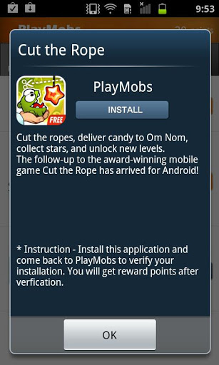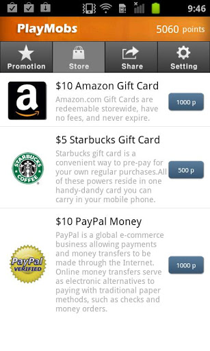 PlayMobs is a mobile reward service that lets users download sponsored apps and redeem rewards, such as Amazon Gift Cards, Startbucks Gift Cards, and Paypal money.Share your referral nickname to get even more reward points The more users we have, the more sponsored apps that we can show you.Refer your Friends, Get Rewarded Tell your nickname to friends and get bonus points for each new memberDiscover great Android apps on PlayMobs and get rewarded Notice Please keep updating new version.PlayMobs iPhoneiPhone users must go to www.playmobs.com on safari browser to sign up.PlayMobs facebook http:facebook.comPlayMobscomPlayMobs twitter http:twitter.comPlayMobs