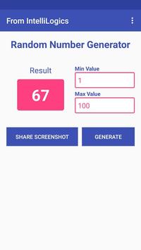 Random number generator is simple and elegant app for generating Random numbers in a give range. Moreover, you can take screen shot with just a button tap and then share the screenshot anywhere such as social media or messaging.