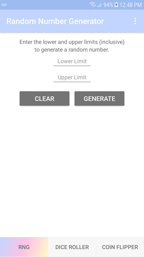 RNG একটি বিনামূল্যে অ্যাপ্লিকেশন যা আপনার পছন্দের দুটি সংখ্যাগুলির মধ্যে একটি র্যান্ডম সংখ্যা তৈরি করে। প্লাস, 1, 2 বা 3 ডাইস এবং মুদ্রা ফ্লিপারের সাথে ডাইস রোলারের জন্য ভার্চুয়াল সিমুলেটর রয়েছে। সহজ ইন্টারফেসটি আপনাকে সহজে সহজে এবং দ্রুত একটি ক্লিকের সাথে অ্যাপ্লিকেশনটি ব্যবহার করতে দেয়।