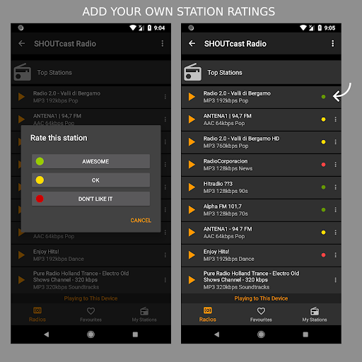 • Keep track of the stations you have tried out by applying a rating. The rating is then visible when browsing stations.