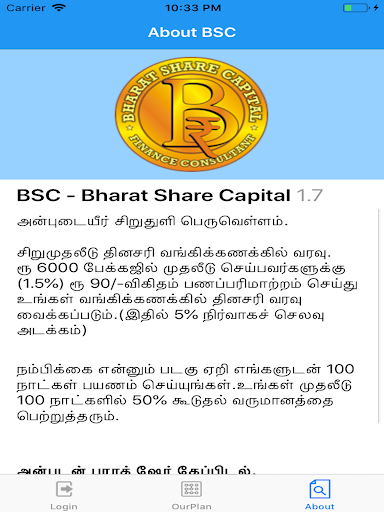 Bharat Share Capital(Finance Consultant) is the Bridging company for common man with established Investment team. Chennai based BSC launched new Marketing concept to reach to the people who are interested in genuine way of Investment with well experienced and proven investment professionals. Our Marketing and their associates members are a young, dynamic, technology driven organization working in a healthy and competitive environment to contribute to the very existence of the society. Lets join with us and grow your investment with 150% within 100days.