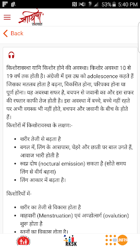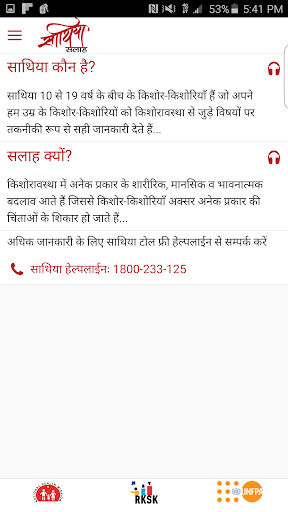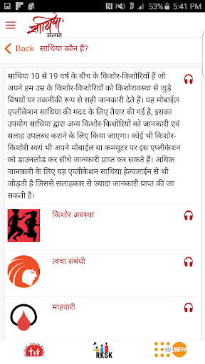 साथिया 10 से 19 वर्ष के बीच के किशोर-किशोरियाँ हैं जो अपने हम उम्र के किशोर-किशोरियों को किशोरावस्था से जुड़े विषयों पर तकनीकी रूप से सही जानकारी देते हैं। यह मोबाईल एप्लीकेशन साथिया की मदद के लिए तैयार की गई है, इसका उपयोग साथिया द्वारा अन्य किशोर-किशोरियों को जानकारी एवं सलाह उपलब्ध कराने के लिए किया जाएगा। कोई भी किशोर-किशोरी स्वयं भी अपने मोबाईल या कम्प्यूटर पर इस एप्लीकेशन को डाउनलोड कर सीधे जानकारी प्राप्त कर सकते हैं। अधिक जानकारी के लिए यह एप्लीकेशन साथिया हेल्पलाईन से भी जोड़ती है जिससे सलाहकार से ज्यादा जानकारी प्राप्त की जा सकती है।