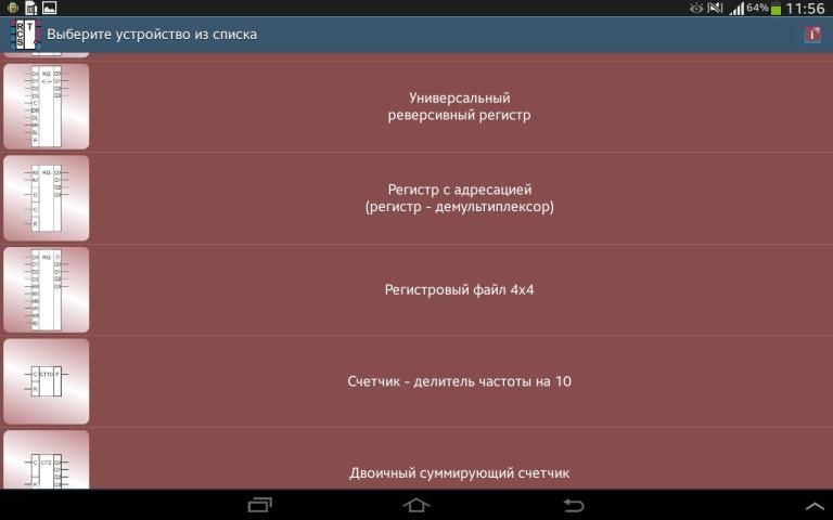 The app covers the main types of sequential devices. These include a variety of trigger elements, registers and counters of various modifications. A distinctive feature of all these devices is the availability of memory, which allows storage of the current state. This allows the use of such devices for short-term storage of individual bits of information small amounts of code words, the implementation of these simple changes, such as the shift to the right or to the left increments or decrements. A total of 42 devices are considered, most of which (30) make up the triggers. Among them, synchronous, asynchronous, single-stage and two-stage RS, D, T and JK flip-flops with direct and inverse inputs, with static and dynamic control. In addition, treated and parallel shift registers, summing, subtracting and reversible counters and frequency dividers.