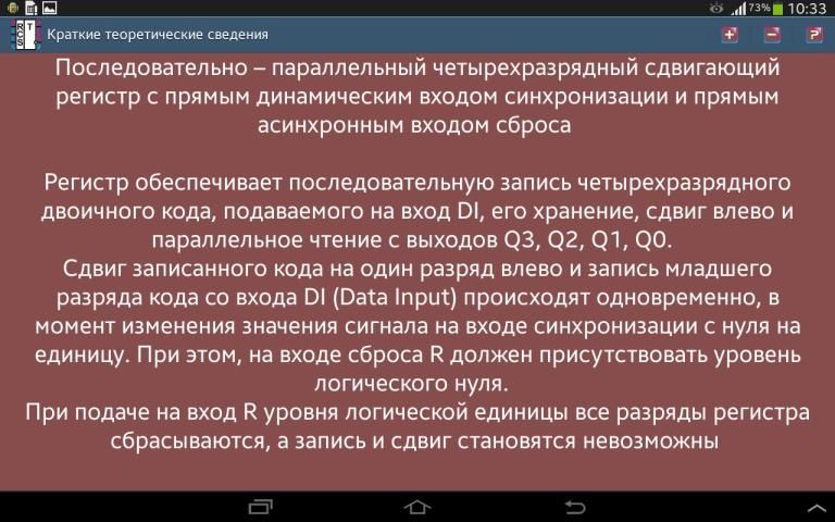 Помимо эмуляции работы, в приложении для каждого из рассматриваемых устройств имеются краткие теоретические сведения, включающие основные определения, назначение выводов и описание алгоритма функционирования, а так же таблицы истинности, описывающие работу устройства в формализованном виде.