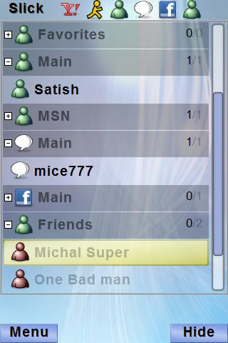 Slick messenger ICQ, yahoo AIM, MSN, google Talk, jabber facebook chat Slick is a messenger application for mobile phones.It allows you to chat with your friends connected thoughvarious online messaging applications.It supports ICQ, AIM, Yahoo chat, MSN, Google talk, Jabber and Facebook chat.