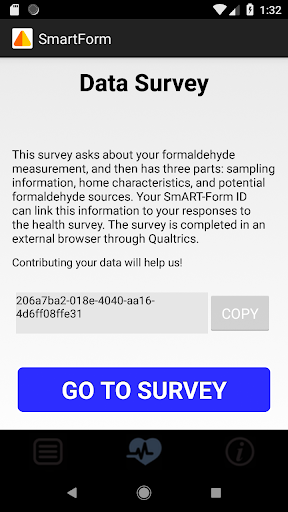 This app and badge system allows users to measure their indoor formaldehyde exposure. The app provides information on recommended formaldehyde levels and tips on reducing exposure if the concentration is high. Users will also be given the option to upload their results and complete a survey to create a national database of formaldehyde levels. The survey will ask about housing characteristics and also include the option to report health symptoms. This database will help researchers and community scientists better understand formaldehyde in housing.