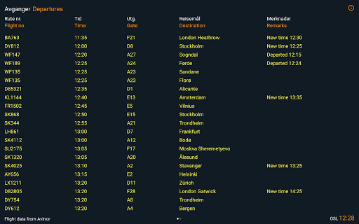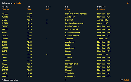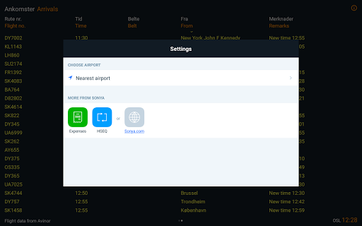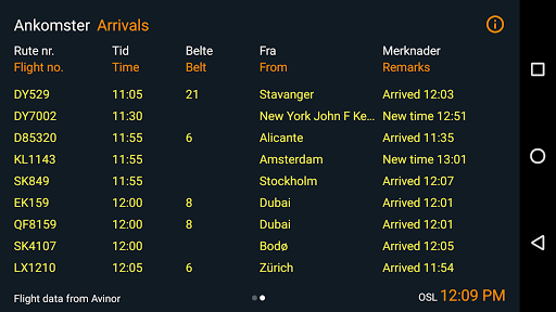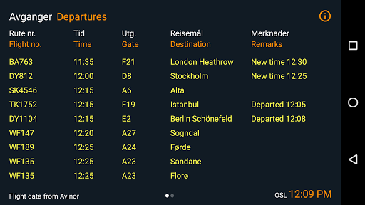 সোনিয়া ফ্ল্যাটাইডার আপনাকে নরওয়েতে সমস্ত বাণিজ্যিক বিমানবন্দরগুলির জন্য আপ টু ডেট আগমন এবং প্রস্থান দেয়।তথ্যটি একটি মসৃণ ইন্টারফেসে প্রদর্শিত হয় যা বিমানবন্দরে তথ্য স্ক্রিনগুলি অনুকরণ করে।