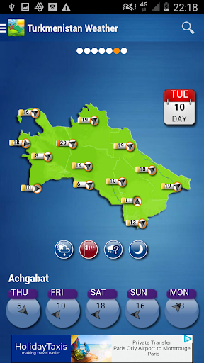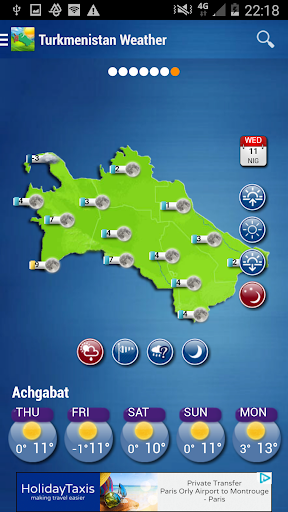 Turkmenistan Weather app provides accurate weather forecasts (weather condition, wind, humidity, ephemeris, alerts) for all cities in Turkmenistan for seven coming days.