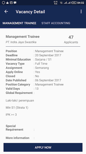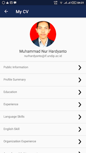 এই অ্যাপ্লিকেশনটি পছন্দসই কাজের তথ্য তথ্যের সহজ অ্যাক্সেস পাওয়ার জন্য Undip ক্যারিয়ার সেন্টারের প্রয়োজনীয়তা পূরণের জন্য এই অ্যাপ্লিকেশনটি উন্নত করা হয়েছিল।উপরন্তু সিভি সম্পাদনা এবং অনলাইন বৈশিষ্ট্য প্রয়োগ করা হয়।