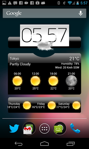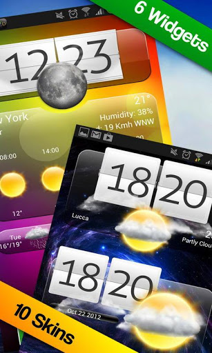 Fantastic, FREE Widgets with clock & weather + professional weather App with 2-day forecastThe most beautiful widgets + weather app for Android!Choose between 6 different Widgets, each skinnable with 10 different themes. Widgets include Digital Clock, weather effects like rain drops or clouds, and weather forecast With just a touch the app enters "full screen mode" with detailed forecast. Other features include detailed weather info, location-aware weather, weather by city name, and more.Weather & Widgets include:- 3 Different Widgets with weather- 10 different Skins for a unique look - Special effects (rain drops, sunshine, clouds)- Sunrise/sunset hours- Completely Free!PRO VERSION (available trough in-app purchase):- Free 7-day Trial- 6 Weather Widgets (including big homescreen)- Super accurate weather by Weather Underground- Radar and moon phases- 10-day hourly weather forecasts (morning, mid-day, evening, night)- Full Screen Weather animations (night & day)- Weather available in 80 languages- Remove Admob bannerThis is THE Weather app... what are you waiting for? download it NOW!