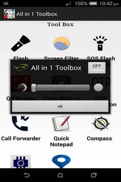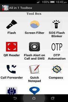 This app provides you 12 Utility applications like Flash Light, SOS flash Blinker, Flash Alert on Call and SMS, QR Code Scanner ,Screen Filter , OTP Automation ,Call Forwarder , Quick Notepad ,Compass ,System Information and Current Location Address which are very much useful