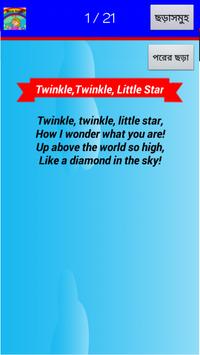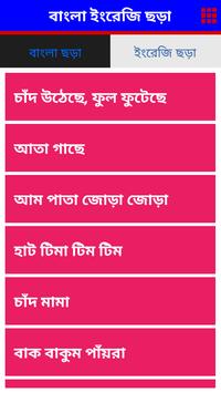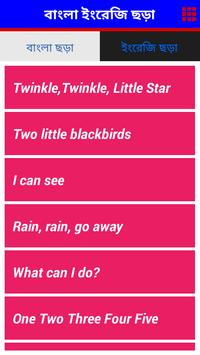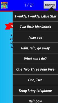 অ্যাপটিতে ৩০ টি বাংলা ছড়া ও ২১ টি ইংরেজি ছড়া আছে আছে। প্রথম স্ক্রিন হতে ব্যবহারকারী বাংলা অথবা ইংরেজি ছড়া ক্লিক করে তাদের তালিকা দেখতে পারবে ।