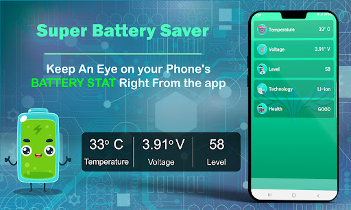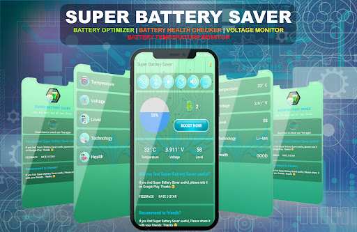 এখন আপনি আপনার স্মার্টফোনের ব্যাটারি লাইফকে বাড়িয়ে তুলতে পারেন, আপনার ফোনের সাথে কম সময় ব্যয় করতে এবং কম ব্যাটারি মাত্রা সম্পর্কে ধ্রুবক উদ্বেগ ছাড়াই আপনার অ্যান্ড্রয়েড স্মার্টফোনের ব্যাটারি জীবন থেকে আরও বেশি সময় কাটাতে পারেন। সুপার ব্যাটারি সেভার - ব্যাটারি অপটিমাইজার আপনার মোবাইল ব্যাটারি জীবনকে বুস্ট করুন, এটির ভোল্টেজ এবং তাপমাত্রা নিরীক্ষণ করুন, আপনার ফোনের ব্যাটারি সম্পর্কে আপনাকে প্রতিটি সামান্য বিস্তারিত দেখায়।